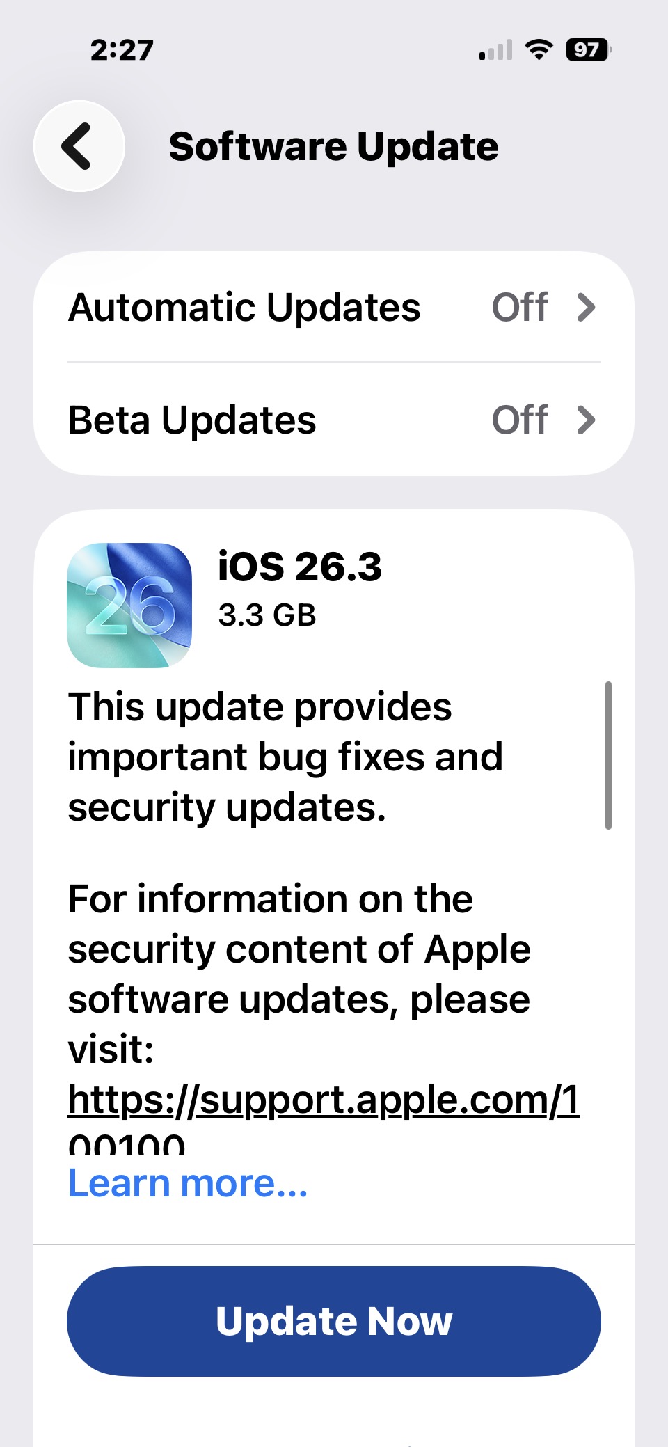 - Seleziona “Aggiorna ora” per scaricare e installare iOS 26.3 per iPhone o iPadOS 26.3 per iPad